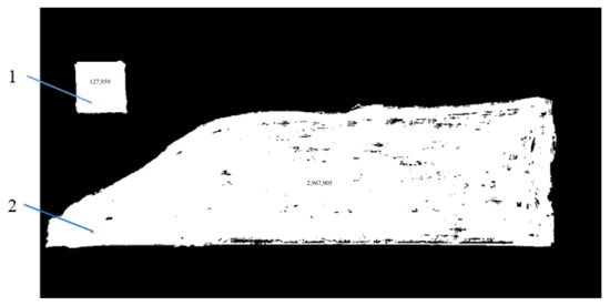 The surrounded area of the curve for each measurement was solved using MATLAB (MathWorks Inc., Natick, MA, USA), before which the closed area outside the curve was blackened, scanned and saved (Figure 3). As shown in Figure 3, a closed square of 1 × 1 cm was drawn on the paper as a reference area, while the closed area 2 was the area to be calculated in Equation (3). The pixels of both areas were computed by MATLAB; therefore, the area of closed area 2 was solved using the proportions between the pixels of the two areas. Finally, the average SPR of each soil sample was obtained through Equation (4).