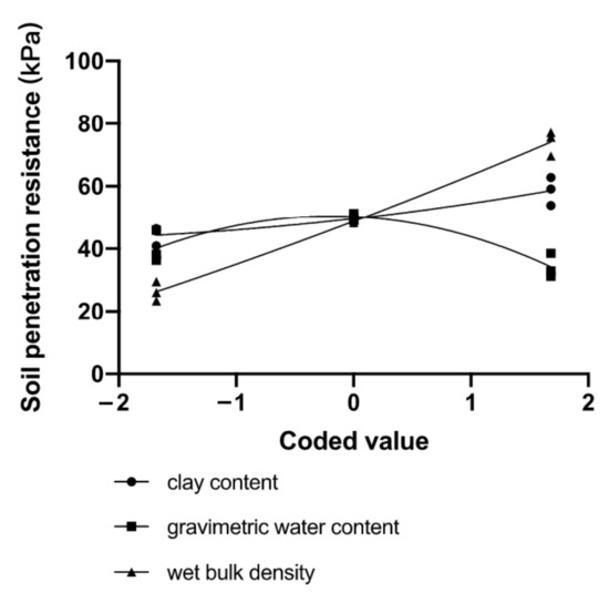 By contrast, the slope of soil water content and SPR curve was lowest among the three curves, indicating that soil water content has the least impact on SPR as compared with soil density and clay content. As illustrated by Figure 4, SPR was negatively associated with soil water content, which decreased from 78.3 to 28.2 kPa when soil water content increased from 30% to 50% (coded value from −1.682 to 1.682). The reduction in SPR with the increase in soil water content is attributed to the more plastic state of soil through lubrication by water, as well as the rearrangement of soil particles [9]. Many have reported strong correlations between SPR and soil water—for example, the SPR characteristic curve that describes a positive correlation between soil SPR and matric suction [40,41]. Vaz et al. (2001) found that SPR increases exponentially with decreasing water content (15–30%) [13], which was in line with Upadhyaya et al. (1982) [27].
