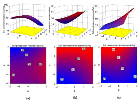Interactive effects of (a) clay content and water content; (b) clay content and density; (c) water content and density on soil penetration resistance (A: clay content; B: water content; C: density).
