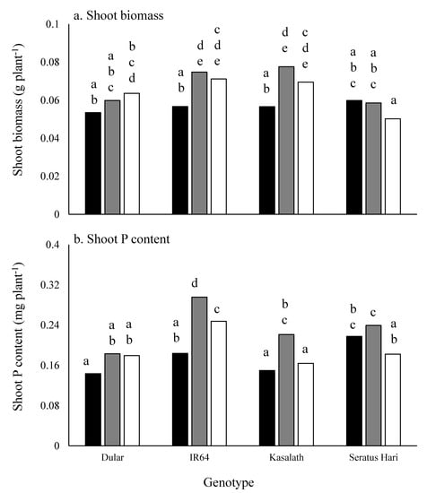 Effect of genotype and phosphorus fertiliser treatment on (a) shoot biomass and (b) shoot P content of 25-day-old rice seedlings grown in a high-phosphorus-fixing Ferralsol. Black bars represent nil P fertiliser, grey bars represent broadcast phosphorus fertiliser and white bars represent banded phosphorus fertiliser. Bars that do not share a common letter are significantly different at p ≤ 0.05.