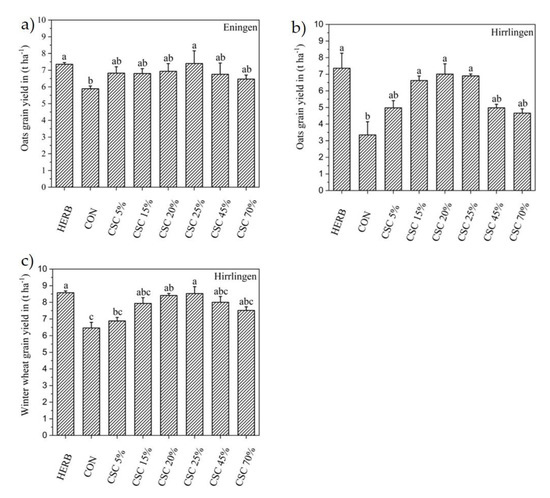 The highest grain yields (7.3 t·ha−1) in oats in Eningen were recorded in the herbicide treatment and the harrowing treatment with CSC of 25% (Figure 5a). Only in these two treatments were yields significantly higher than in the untreated control with 5.9 t·ha−1.