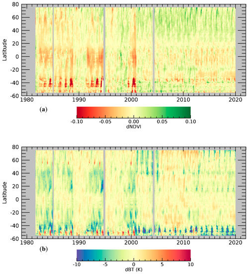 62]. The benchmark values are weekly averages according to each latitudinal band, from following 5 years of smoothed values: 1989, 1990, and 1995–1997, which are regarded as the best quality observation years of AVHRR [