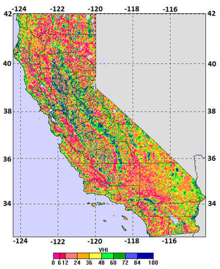 64]. The drought severely reduced California’s surface and ground water by 52% and 28% capacity, respectively. The estimated total economic drought impact was 2.74 billion USD. However, due to the irrigation system being widely used in California’s agricultural area, especially in the Central Valley, the loss in crop revenue was only 3%. Even at the highest peak of the drought period, the 500 m resolution VIIRS VHP could still detect favorable conditions for vegetation. As shown in
