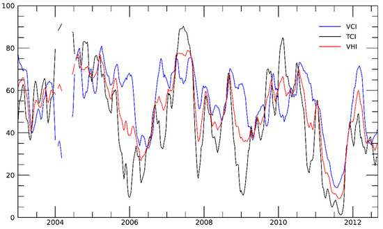 Figure 4 repeats the time series of the same period, but using VCI, TCI, and VHI. As expected, VHI resembles exceptionally well the fluctuation of the TWS anomaly curve, and VCI follows the precipitation anomaly curve. Besides the exceptional drought of 2011, moderate droughts and water deficits in 2006, 2009, and 2012 were also detected. Furthermore, following TCI time series shown in