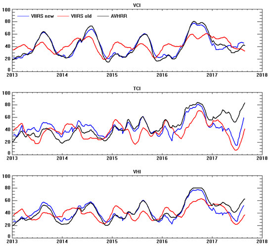 57] derived a simple equation to express the pseudo VIIRS 36-year climatology using the AVHRR 36-year climatology and their overlapping 5 year climatology. As a result, the second generation of VIIRS VCI/TCI/VHI reaches the continuity, it could trace the signature of the long-term AVHRR vegetation health products closely, in terms of histogram, correlation coefficients, time series, and so on, which expedites the maturity of the VIIRS VHP by more than one decade.