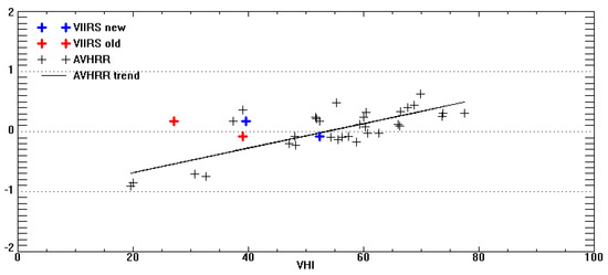 23], using AVHRR VHI alone, the correlation coefficient could be greater than 0.77 at the maximum, which is good enough for crop yield application. Considering all the scattered points of AVHRR VHI-dY as a cluster, this cluster could be along the regression line and relatively narrow. By adding two years of the VIIRS old VHI-dY, one can see that one point is at the edge of the cluster, and another point is out of the cluster, which degrades the former correlation coefficient and greatly alters the regression coefficients. However, if we add two years of the VIIRS new VHI-dY, they locate well within the cluster, which regain the former correlation coefficient and the regression coefficients. Adding more years of the new version of VIIRS VHI-dY, the relationship remains the same.