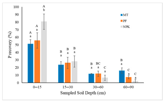 Average P recovery (%) at 0–15, 15–30, 30–60, and 60–90 cm for 2006 and 2018. MT = manure treatment, PF = phosphorus fertilizer, NPK = nitrogen-phosphorus-potassium. Error bars represent standard error. Different lowercase letters represent significantly different treatment means within each soil depth, and capital letters represent comparisons of depth means within each treatment determined by Tukey’s HSD test (p < 0.05).