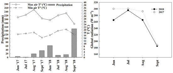 The 2017 and 2018 microclimate conditions of the experimental area are reported in Figure 1.