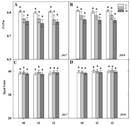 Maximum quantum yield of PSII (Fv/Fm) (A, 2017; B, 2018) and chlorophyll content (C, 2017; D, 2018) of V. vinifera with three different soil management practices: T (tillage; white columns), C (cover cropping; light grey columns), and M (mulching; dark grey columns). Measurements were conducted at full veraison (t0: 7 July 2017 and 17 July 2018), mid maturation (t1: 28 July 2017 and 15 August 2018), and full maturation (t2: 5 September 2017 and 17 September 2018). Data (mean ± SE, n = 10) were subjected to one-way ANOVA. Values with different letters are statistically different. (LSD test, p ≤ 0.05).