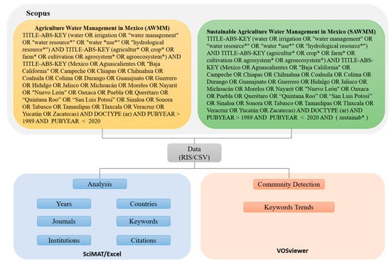 The objective of this article is to analyse the dynamics of the research on the use of water in agriculture in Mexico and especially its sustainable management. To achieve it, a bibliometric analysis has been carried out on a sample of 1490 articles in the research on AWMM and 436 articles in the case of the research on SAWMM. For each of the lines of research, a productivity analysis has been developed based on the number of articles, the journals, the subject categories, the authors, affiliation, and collaboration relations. The principal topics developed in each of them have also been analysed according to the keywords used.