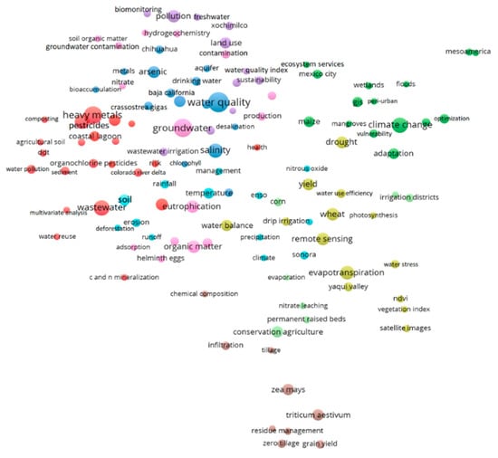 As could be expected, in Figure 2, we can find a large number of different clusters (a total of 9), reflecting the diversity of the topics within the general research. The red cluster refers to the pollution of water bodies. In Mexico, more than half of the waste water is not treated [46]. The uncontrolled discharging of untreated, reused water can generate negative effects derived from the pollution of water bodies and agricultural soils [47]. Pérez-Castresana et al. [48] find, for example, that the quality of the water of the River Atoyacd, on which the agricultural activities greatly depend in the area of Puebla, has been compromised due to the discharging of large amounts of poorly treated waste water. Meanwhile, the application of fertilizers has also been shown to be a cause of pollution of water and agricultural soils [49]. García-Hernández et al. [24] analysed the research on the effect of the use of pesticides in Mexico, finding that they have had negative impacts on the land and coastal ecosystems and on the health of the agricultural workers and their families.