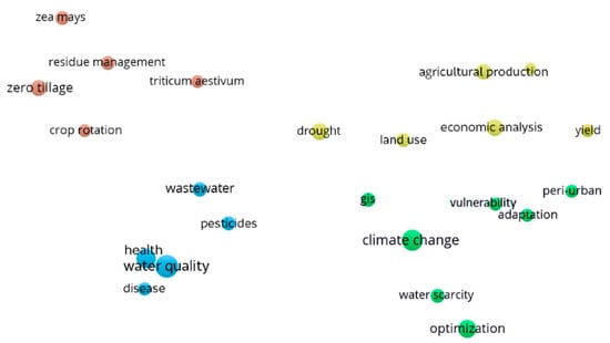 The green cluster refers to the environmental dimension of sustainability. It is focused on the research of climate change effects on the availability and management of water resources. This confirms that the environmental perspective of sustainability receives more attention than the rest of the dimensions. In this respect, farmers must take into account the climate variations as part of their production system in order to guarantee the survival of their economic activity and food security [78]. Furthermore, it will also be necessary to identify and study the agricultural areas most prone to variations in order to be able to design specific adaptation plans that minimise their vulnerability to climate change [79].