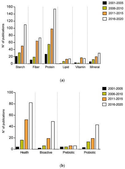 Number of publications about sourdough over the period 2001–2020, separated in 5-year periods, according to the Scopus database (last accessed 30 June 2020). (a) Publications on sourdough according to the relation with sourdough components. Search: “sourdough AND starch/fibre/protein/lipid/vitamin/mineral”. (b) Publications on the sourdough-health relationship, and functioning components. Search: “sourdough AND health/bioactive/prebiotic/probiotic”.
