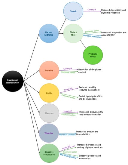 There has been growing demand by consumers for grain-based products with well-balanced nutritional profiles and health-promoting properties. The components of the flours obtained from different grains can be modified or improved at a nutritional level by using sourdough technology, which has gained increasing interest in recent years. Sourdough hydrolyse dietary fibre, reduces fat rancidity, and enables an increase in starch and protein digestibility, as well as vitamin levels and mineral bioavailability. In addition, bioactive compounds are synthesized during fermentation, while components that interfere with the digestion of grain-based products or digestion-linked pathologies, such as gluten sensitivity or gastrointestinal syndromes, are reduced. Finally, it has been observed that sourdough fermented products can play a role in gut microbiota regulation. Thanks to this health-promoting potential, sourdough can stand out among other fermentation processes and opens up a new range of healthier commercial products to be developed. The current review discusses the extensive research carried out in the last 15 years and aims at updating and deepening understanding on how sourdough can enhance the nutritional and health-related characteristics of the different components present in the grains.