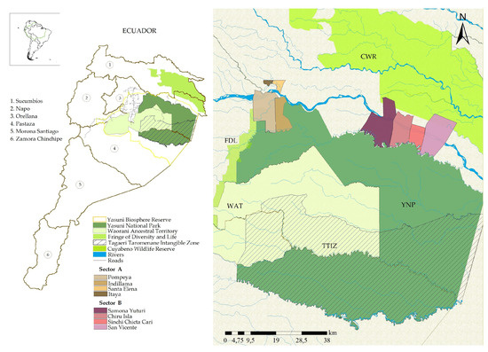 Sectors A and B located in the north of the Yasuní Biosphere Reserve (YBR) in the Ecuadorian Amazon region.