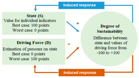 Each indicator contains parameters that describe the state of the system (S) and the driving force (D) within the system, leading it in a certain direction of development. S indicates the current condition of each specific indicator, and D is a measure of estimated pressure exerted by the agricultural system on the specific indicator [60]. The state parameters have a value between 0 (worst case) and 100 (best case). The driving force parameters are also calculated using a range of 0 to 100, but since they are valued as a negative pressure in the system, 0 represents the best case and 100 the worst case (the highest pressure).