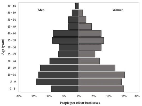 We studied the Kichwa population structure and its distribution by sex and age from a population pyramid (statistical representation) [90] to examine its implications with traditional production systems [91]. We calculated the following indices: (1) proportion of young population (<14 years) (); (2) proportion of adult population (between 15 and 64 years, ); (3) ratio of children to women, defined as the number of children under 5 years of age for each woman of reproductive age (R); (4) the ratio of men, consisting of the ratio of men for every 100 women in a given population, considered as the first indicator for analyzing the distribution by sex in the population (); (5) youth dependency ratio, which is the relationship between the potentially dependent age population (<15 years) and the potentially active age population (between 15 and 64 years, (); (6) the structure index of the active age population, which is the relationship between the population from 40 to 64 years and the population from 15 to 39 years (); and (7) the rate of change of the active age population (), which is the relationship between the population from 60 to 64 years and the population from 15 to 19 years [90,91,92,93,94], as follows: