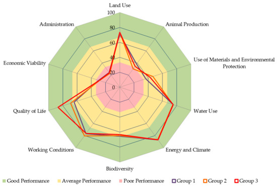 In the three groups (Table 4), the indicators identified by level of importance (highest to lowest average scores) were: energy and climate (86.82), working conditions (77.89), water use (74.97), and land use (72.62). The quality of life indicator in groups 2 and 3 had a difference of 17.77. The indicators that scored medium performance were biodiversity and use of materials and environmental protection, with average values of 64.52 and 41.94, respectively. In groups 1 and 3, the indicator animal production had a difference of 3.56 and the quality of life in group 1 has a score of 64.25. The lowest performing indicators were: economic viability and administration, presenting averages of 29.19 and 23.66, respectively; and in group 2, the indicator animal production was 30.38.