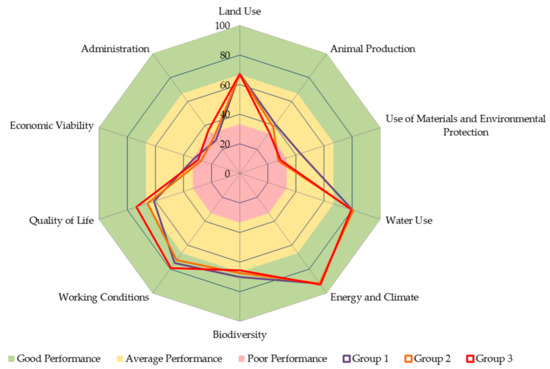 The overall sustainability indicator in all three groups was medium, with the best score being in group 1, which was 2.11 and 0.34 higher than in groups 2 and 3, respectively. The dynamics of the degree of sustainability by groups and color were blue for group 1, orange for group 2, and red for group 3 (Figure 7).