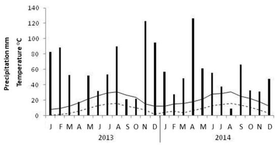Monthly temperature minima (dashed line) and maxima (solid line) and precipitation (bars) during 2013 and 2014.