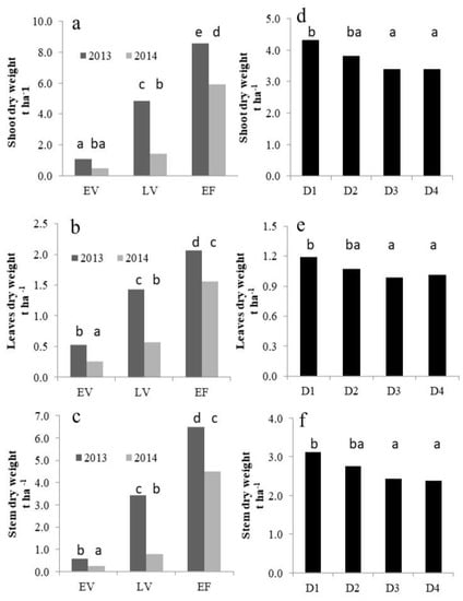 Dry biomass as affected by experimental treatments; (a–c) interaction between growth stage and year. Bars represent means averaged over density and fertilization. EV = early vegetative; LV = late vegetative: EF = early flowering. (d–f) main effects of sowing density. Bars represent means averaged over fertilization, stage and year; D1 = 125 plants m−2; D2 = 25 plants m–2; D3 = 8 plants m−2; D4 = 4 plants m−2. Different letters over bars indicate significant differences among means across all combinations of growth stages and years (a–c) or across all levels of density (d–f) by Tukey’s multiple comparison test ((p < 0.005).