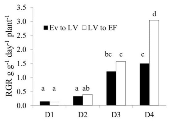 Relative growth rate (RGR) = (mean ln shoot biomass t2—mean ln shoot biomass t1)/(t2 − t1) g g−1 d−1 plant−1 [40].