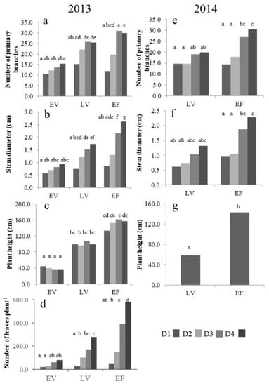 The results of post hoc mean comparison are depicted in Figure 4. In both 2013 and 2014, stem diameter and the number of primary branches (Figure 4a,b,e,f) were affected by plant density (p-value < 0.0001), but the values of the two highest densities (D1 and D2) could not be significantly discriminated, while their differences from the lower densities (D3 and D4) became more marked as the plant cycle proceeded. In fact, while at low densities, values increased throughout the plant cycle; in the D1 treatment, there were no significant differences between growth stages.