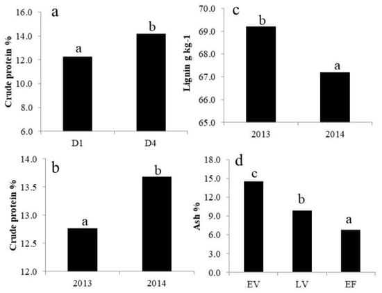 Figure 5 depicts the main effects of the experimental treatments on forage quality, while Figure 6 and Figure 7 show the effects of the interactions with sowing density and N-fertilization, respectively. Crude protein content was significantly higher in D4 (14.18%) compared to D1 (12.28%) (Figure 5a; p < 0.005). Differences between years were significant for crude protein and lignin content; namely, in 2014, there was a higher protein content while lignin decreased (Figure 5b,c; p < 0.05). Ash content was only influenced by the growth stage declining from EV to EF (Figure 5d; p < 0.05). For lipids, lignin and NDF, there was a significant interaction between sowing density and growth stage; lipids decreased with increasing density (Figure 6a; p < 0.005), while fiber content increased (Figure 6b,c, p < 0.005).