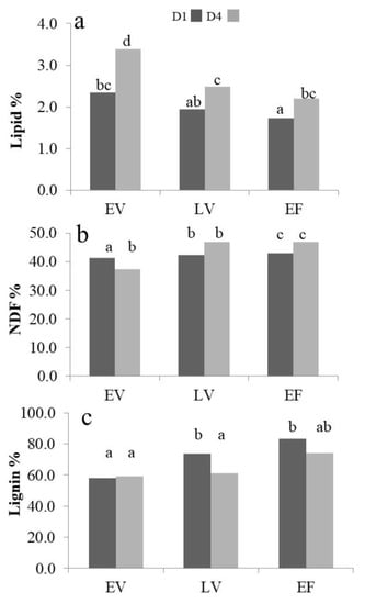 Interaction between sowing density and growth stage on gross forage quality: (a) lipids, (b) NDF and (c) lignin. Bars indicate means averaged over fertilization and year. EV = early vegetative; LV = late vegetative; EF = early flowering. D1 = 125 plants m−2; D4 = 4 plants m−2. Different letters over bars indicate significant differences among means across all combinations of growth stage and sowing densities D1 and D4 by Tukey’s multiple comparison test (p < 0.005).