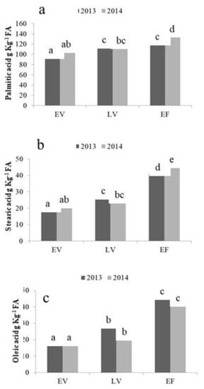 The most abundant saturated fatty acid (SFA) was palmitic acid, with an average proportion of 117.70 g kg−1 FA, while stearic acid constituted only 30.41 g kg−1 FA. Monounsaturated oleic acid was, on average, 28.83 g kg−1 FA. In many cases, individual FA proportions changed during growth and between years. The results of the post-hoc comparison are depicted in Figure 8 and Figure 9.