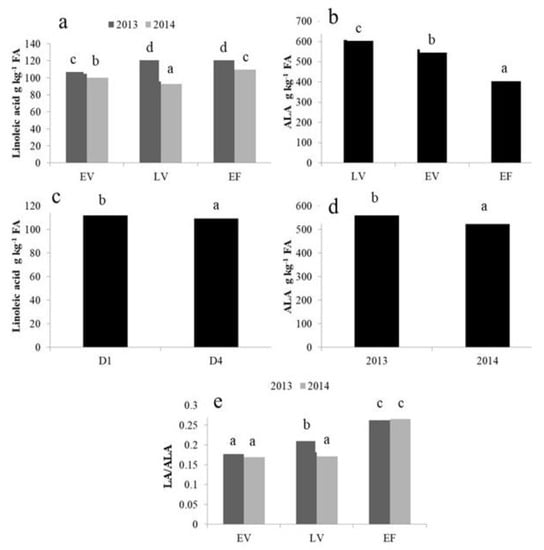 Polyunsaturated fatty acid profile (a–d) and LA/ALA ratio (e) as affected by experimental treatments as main effects or in interactions. Bars indicate means averaged over sowing density and nitrogen treatment (a,e); over density, year and nitrogen treatment (b); growth stage, year and nitrogen treatment (c); or density, growth stage and nitrogen treatment (d). EV = early vegetative; LV = late vegetative; EF = early flowering. D1 = 125 plants m−2; D4 = 4 plants m−2. LA = Linoleic Acid; ALA = alpha-linolenic acid. Different letters over bars indicate significant differences among means across all combinations of growth stage and year (a,e) or across all levels of growth stage (b), density (c) and year (d) by Tukey’s multiple comparison test ((p < 0.005).