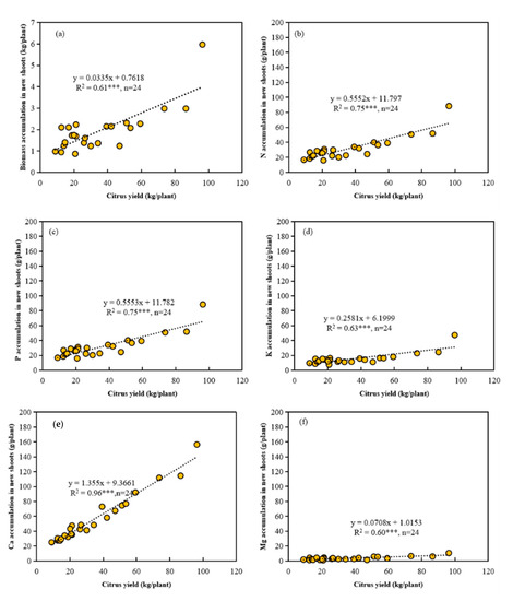 Relationships between citrus yields (kg/plant) and shoot biomass (a), nitrogen (b), phosphorus (c), potassium (d), calcium (e) and magnesium (f) accumulations (g/plant) of citrus trees. The letters denote the panels. *** indicated significance at p < 0.001.