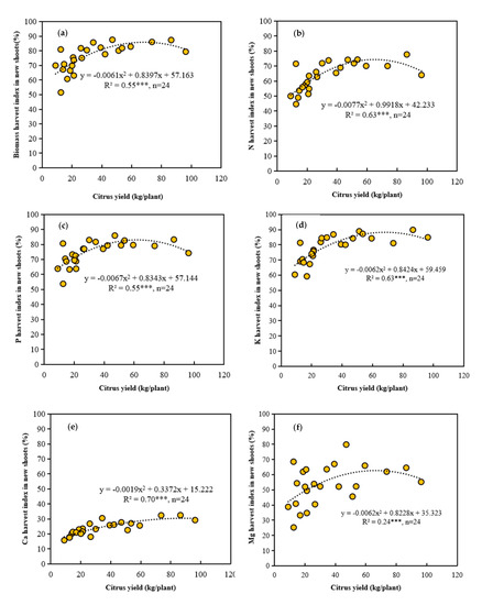 Relationships between citrus yields (kg/plant) and biomass (a), nitrogen (b), phosphorus (c), potassium (d), calcium (e) magnesium (f) harvest in new shoots (%). The letters denote the panels. *** indicated significance at p < 0.001.