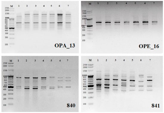 RAPD (using OPA_13 and OPE_16 primers) and ISSR (using primers 840 and 841) profiles of microcuttings of Daphne mezereum. M—ladder, 1—“0” without cytokinins, 2—medium with mT, 3—medium with BA, 4—medium with kin, 5—medium with Zea, 6—medium with 2iP, 7—medium with TDZ.
