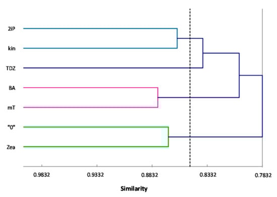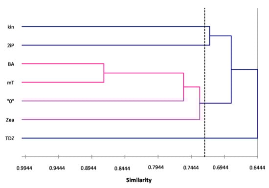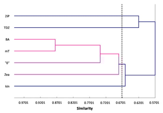 UPGMA dendrogram of pooled RAPD-ISSR analysis showing the genetic relationship between randomly selected Daphne mezereum microcuttings regenerating on WPM medium with the addition of selected cytokinins or without (“0”); dashed line: value of Jaccard’s coefficient.