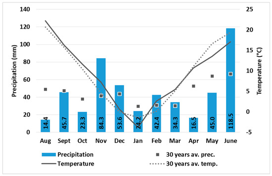 Climatic and weather conditions are continental and often extreme. Figure 1 shows the climatic conditions of the 2019/2020 crop year for the winter barley experiment in Debrecen. Thirty years’ (1981–2010) annual average temperature is 10.3 °C; precipitation is 560.1 mm. The sum of precipitation from September to June was 487.8 mm in 2019/2020 and the 30 years’ average is 444.9 mm, so the sum was higher than the 30 years’ average, but the distribution was uneven. In August, September and October, rainfall was in sum 51 mm less than the 30 years’ average, with temperatures higher than average, as well. The moisture content of the soil was very low around the sowing time and during germination, and the emergence of barley. In October, rain fell only on two days, (4th, 8.3 mm and 6th, 15 mm).