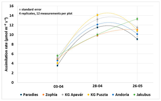 We detected changes in the assimilation rate of the winter barley cultivars during the growing season. Of course, these are actual values, but we can compare the varieties to each other at different dates. The differences among the varieties were significant (p < 0.05). Highest values were measured on 28 April (BBCH 47–49), except for Jakubus and Zophia, where the highest values were on 26 May (BBCH 73–75) (Figure 2). The changes varied by genotype, but curves run fairly likewise in Paradies, KG Puszta, Andoria and KG Apavár. Jakubus has the highest value among the varieties on 3 April and 26 May, but the second lowest on 28 April. Its assimilation rate changed near linearly in the whole growing season, while the others’ rates slightly decreased after 28 April.