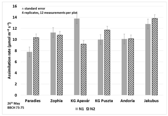 The experiment has demonstrated that N fertilization caused not significant differences in assimilation rate (p = 0.90) in general, but as Figure 3 shows the cultivars had varying reactions. Paradies, KG Puszta and Jakubus had higher assimilation rates at higher N levels, while Zophia and KG Apavár had lower rates, and the photosynthesis of Andoria did not change. The discrepancy in KG Apavár was −4.58 µmol m−2 s−1. KG Apavár is an extensive variety and cannot tolerate the higher N doses. The difference was significant in three varieties (KG Apavár, KG Puszta and Paradies) at p = 0.05 level, but in general the differences were not statistically significant, because the varying reactions of the cultivars.