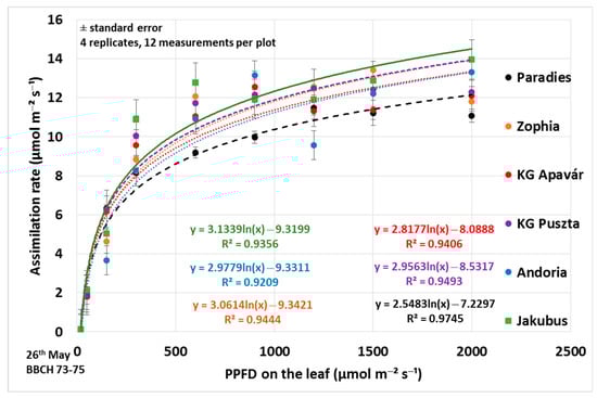 Assimilation rate light curves of winter barley cultivars, 26 May (BBCH 73−75), N90P45K50 (Debrecen, 2020) 4 replicates, 12 measurements (2 leaves, 6 recordings per leaf). Barley cultivars’ assimilation rates were similar at the low PPFD levels, but there are differences at higher light levels. PPFD: photosynthetic photon flux density.