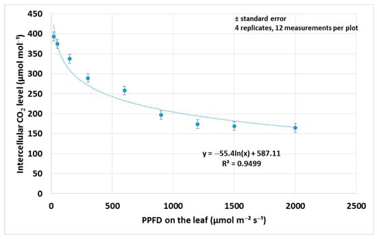 Intercellular CO2 level light curve in winter barley, average of cultivars, 26 May (BBCH 73–75), N90P45K50 (Debrecen, 2020) 4 replicates, 12 measurements (2 leaves, 6 recordings per leaf). Increasing PPFD resulted in decreasing intercellular CO2 level caused by stomata closing. The change was especially expressed from 20 to 900 µmol m−2 s−1 PPFD levels. PPFD: photosynthetic photon flux density.
