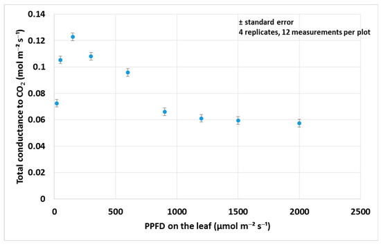 Total conductance to CO2 light curve in winter barley, average of cultivars, 26 May (BBCH 73–75), N90P45K50 (Debrecen, 2020) 4 replicates, 12 measurements (2 leaves, 6 recordings per leaf). Higher PPFD levels caused stress and decreased significantly the total conductance to CO2. The change was significant above 900 µmol m−2 s−1 PPFD levels. PPFD: photosynthetic photon flux density.