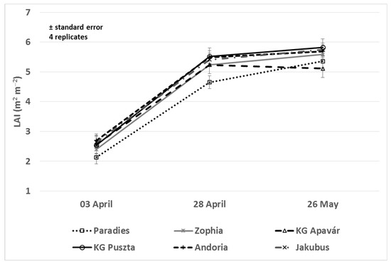 Leaf area index was measured three times in the growing season in each plot. Statistical analysis did not prove significant differences among the varieties on any date. Highest values were registered on 26 May, from 5.11 to 5.82 m2 m−2 depending on the cultivar (Figure 7). Leaf area development of barley plants almost was complete by 28 April (BBCH 47−49), it changed on average by 0.3 m2 m−2 afterwards. Leaf area formation time was somewhat diverse, but correlation analysis showed a strong to very strong significant relationship (r= 0.663−0.759, p < 0.001) among the LAI values of the different dates in the varieties.