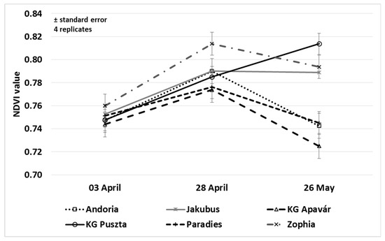 The results of NDVI measurements showed differences between the cultivars on each of the three dates. On 3 April (BBCH 27−29), the discrepancies were not significant statistically, the variations were from 0.748 to 0.760. On 28 April (BBCH 47−49), only the NDVI value of Zophia (0.814) was higher significantly, compared to other cultivars (0.774−0.790). On 26 May, NDVI data showed significant differences among the varieties (p < 0.001). NDVI values of KG Puszta grew continuously in the growing season (0.748, 0.785, 0.814). The other five varieties had highest values on 28 April and these values decreased after that date (Figure 8). The KG Apavár variety had the lowest values in all of the three measurements (0.744, 0.774, 0.725).