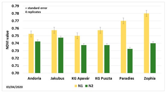 We also investigated the effect of N supply on the NDVI values. The results on 3 April differed from our expectations, as Figure 9 shows the plots under higher N fertilization had lower NDVI values. The difference was statistically significant at p = 0.05 level in all varieties. Later in the season, the 60 kg ha−1 plus nitrogen dose had an effect on the NDVI data and we measured on average 0.0046-higher NDVI values in the N2 treatment plots. The difference varied from −0.015 (Paradies) to 0.028 (Jakubus), depending on the variety (Table 5).