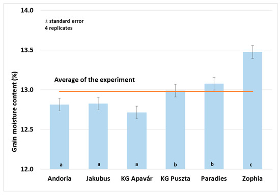 Grain moisture content of winter barley cultivars, average of N treatments (Debrecen, 2020). Standard error of means, 4 replicates. Means are compared to the average of the experiment. All varieties had adequately low grain moisture content to the storage. The differences in grain moisture content were statistically significant among the varieties. Different letters mean statistically significant difference (p < 0.05).