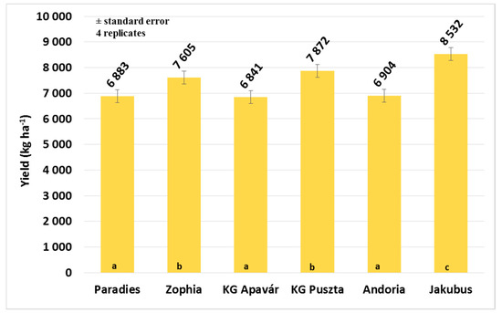 Grain yield of winter barley cultivars, average of N treatments (Debrecen, 2020). Standard error of means, 4 replicates. The differences in grain yields were statistically significant among the varieties. Different letters means statistically significant discrepancy between averages (p < 0.05).