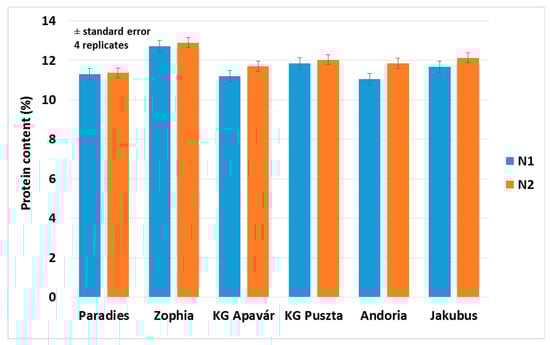Protein content of winter barley cultivars in connection to N-supply (Debrecen, 2020). Standard error of means, 4 replicates. The positive effect of higher N level on protein content has not been proved, protein content was determined genetically. N1: N90P45K50; N2: N150P45K50 kg ha−1.