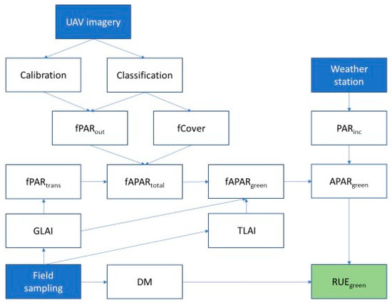 RUE estimation uses in-field sensors and destructive sampling to acquire the needed components consisting of incoming radiation, reflectance data, total leaf area index (TLAI), green leaf area index (GLAI), and dry matter (DM). Sensors are placed below the canopy facing the soil for PARsoil, above the canopy facing down to gather reflectance (PARout), above the canopy facing up for PARinc, and beneath the canopy facing up to determine the PAR passing through the canopy (PARtrans). This cumbersome method makes RUE estimation on a small plot scale with various treatments unreasonable. However, applications involving Unmanned Aerial Vehicles (UAV) provides a potential workaround. Tewes and Schellberg [5] demonstrated the derivation of reflectance (PARout) for estimation of RUE in corn (Zea mays, L.) using a UAV and a consumer-grade camera. Their RUE estimations were similar to previously published values for maize [5].