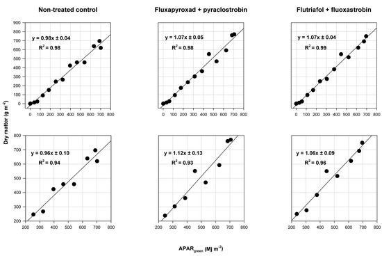 The function of accumulated dry matter and absorbed photosynthetically active radiation by the green leaf area (APARgreen) excluding frogeye leaf spot disease severity. The top row represents sampling dates from 22 to 130 days after planting (DAP) and the bottom row represents sampling dates after fungicide application, 70 to 130 DAP. Radiation use efficiency (RUE) is the slope of the regression equation. The intercept of the equation is not shown.