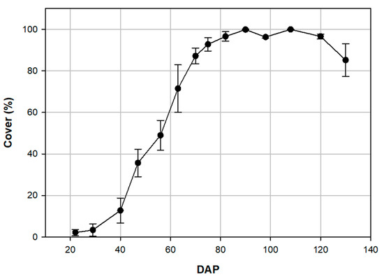 The development of foliar cover across the collected sampling dates from 22 to 130 days after planting (DAP) with error bars showing standard deviation.